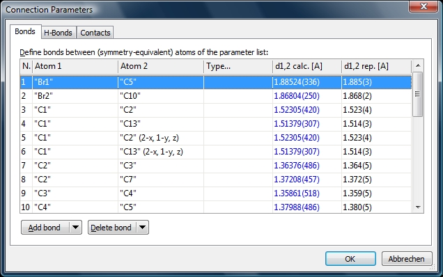 Screenshot of "Bonds" page of "Connection Parameters" dialog listing bond parameters