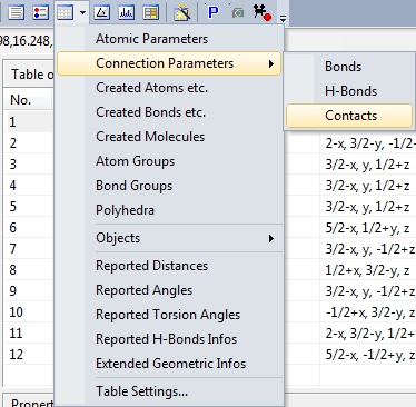 contact parameters are available through the "View"/"Table" sub-menu or from the corresponding