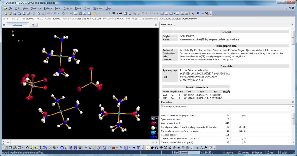 Definition of "Expand" and "Reduce" This article shows how to expand from a set of atoms or a molecule via neighbouring molecules to a cluster and to reduce that cluster back to a smaller ensemble of molecules again. You can do this with or without H-bond and/or contact definitions -- starting from a selected atom or a selected molecule or from the whole current ensemble in the structure picture. Sample #1: Expand via neighbouring atoms We use the sample compound "COD-1500005-molecules.diamdoc" to demonstrate that. This file comes up with a structure picture "Molecules" containing ten molecules created from the atomic parameter list. (This is done, as you already know from older Diamond versions, with Shift+Ctrl+M or the corresponding icon in the Picture toolbar, which is normally at the bottom of the Diamond application window.) Note: The screenshots have been made with Diamond version 4 but all functions are available in current version 5, too.