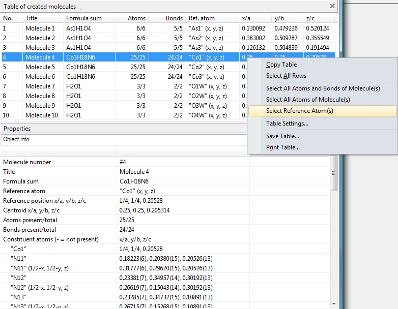 Clicking with the right mouse button on the "Molecule 4" row in the table of created molecules and choosing command "Select Reference Atom" marks the atom "Co1" (at x,y,z) in the lower left of the structure picture. Running command "Edit"/"Select Molecule" (or accelerator Ctrl+M), followed by "Edit"/"Invert Selection" (or Ctrl+I), followed by "Edit"/"Delete" (or "Del" key) leaves the "Molecule 4" alone in the picture, which will serve as starting point for our expansions and reductions. We also press accelerator key Ctrl+Alt+4 to switch the model from "ball and stick" to "ellipsoid".