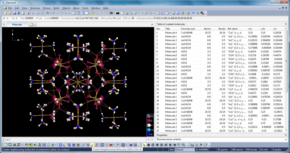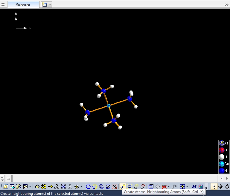 If you want to, you may start another round finding neighbouring molecules. The example above applies to the whole molecule "Molecule 4", but you could have marked a special atom of the molecule, for instance one of the N atoms rather than the "Co1" in the center, to show selectively the neighbourhood of that N atom. Sample #2: Create neighbouring molecules Finding and creating neighbouring molecules goes quicker with the "Create Neighbouring Molecules" symbol in the toolbar (or Shift+Ctrl+Z). Go back to the picture with the one molecule "Molecule 4" (close and re-open document or make undo steps). Two runs of the command lead to the following screen shot. (Maybe you have to hit the F9 key to adjust the picture into its structure picture window.)