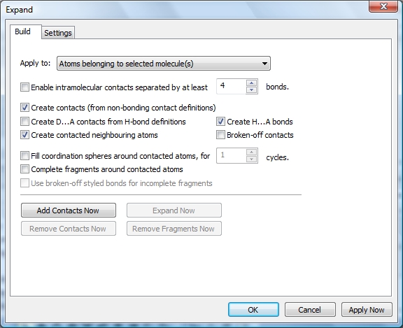 Using dialog "Expand" from the command "Build/Expand..." The Expand dialog from the "Build/Expand" command offers several settings if to apply to all atoms or selected atoms or selected molecules, to enable intramolecular contacts, to regard H-bond definitions, too, and what to do with the contacted neighbouring atoms (broken-off bonds around or complete fragments).