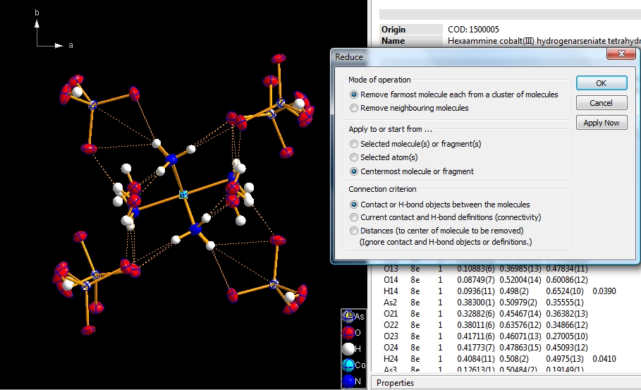 And repeating "Reduce" several times leads you finally back to a picture with the one and only "Molecule 4". The contact definitions in the example above come from "_geom_hbond_xxx" definitions in the 1500005.cif file. But there are several possibilities to change, add, or remove definitions for non-bonding contacts in the "Connectivity" dialog ("Build" menu).