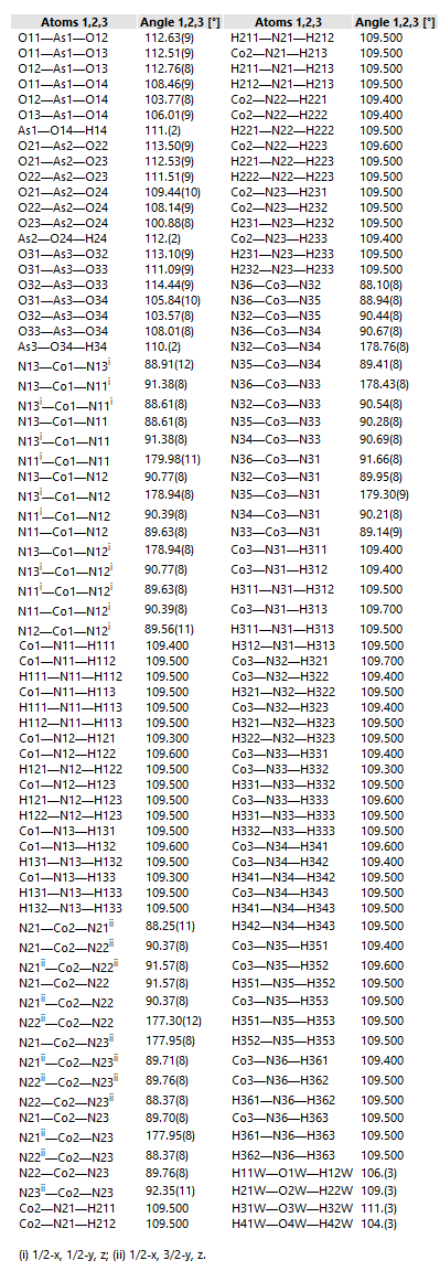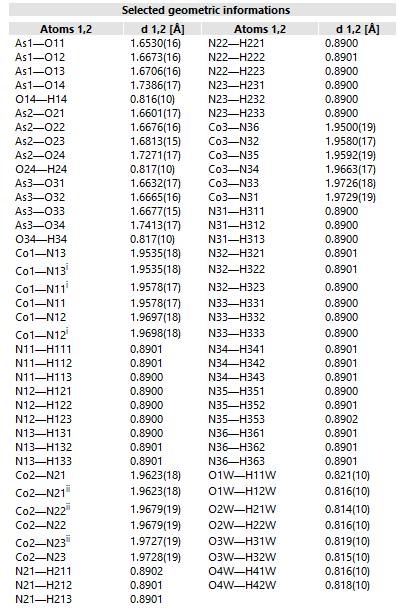 About reported distances, angles, and torsion anglesA Diamond document uses several lists for geometric informations about the current structure data set: Reported distances Reported angles Reported torsion angles Tables of reported distances, angles, and torsion angles The reported geometric informations can be listed in the data pane by the corresponding commands in the Table sub-menu of the View menu. Each row in the table comprises informations about the two, three, or four atoms involved and the distance and angle information. More details are available from the properties pane - usually below the table of reported geometric information. (See screenshot of table of reported distances above.) Distance, angle, and torsion angle informations in the data sheet The "comprehensive" configuration of the data sheet summarizes all informations available "reported" distance, angle, and torsion angle informations. The following is a screenshot of the data sheet of the sample document "COD-1500005-one-Co(NH3)6-molecule.diamdoc". The section "Selected geometric informations" lists the interatomic distances that have been imported from a list of "_geom_dist..." informations in a CIF file or have been created in Diamond by measuring distances or have been created by copying from the table of (calculated) distances. The list of distance informations is followed by a list of angle informations.