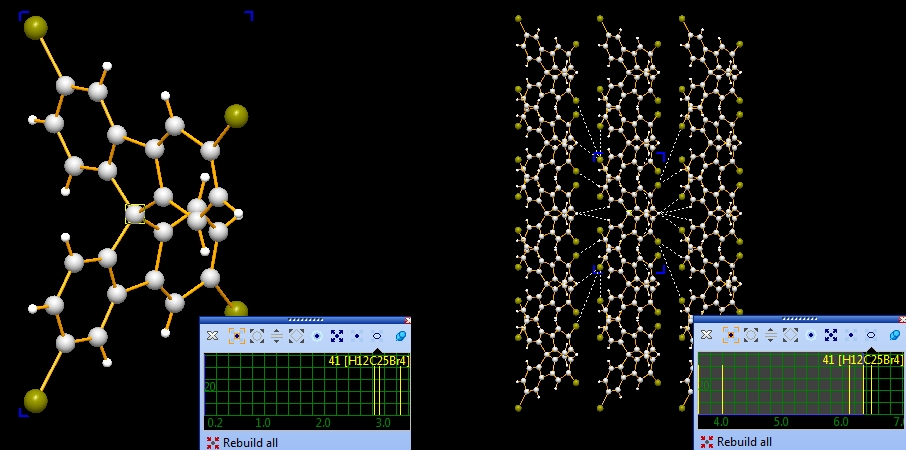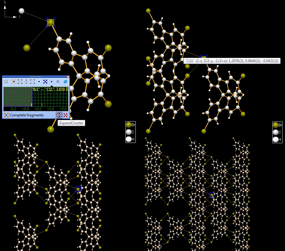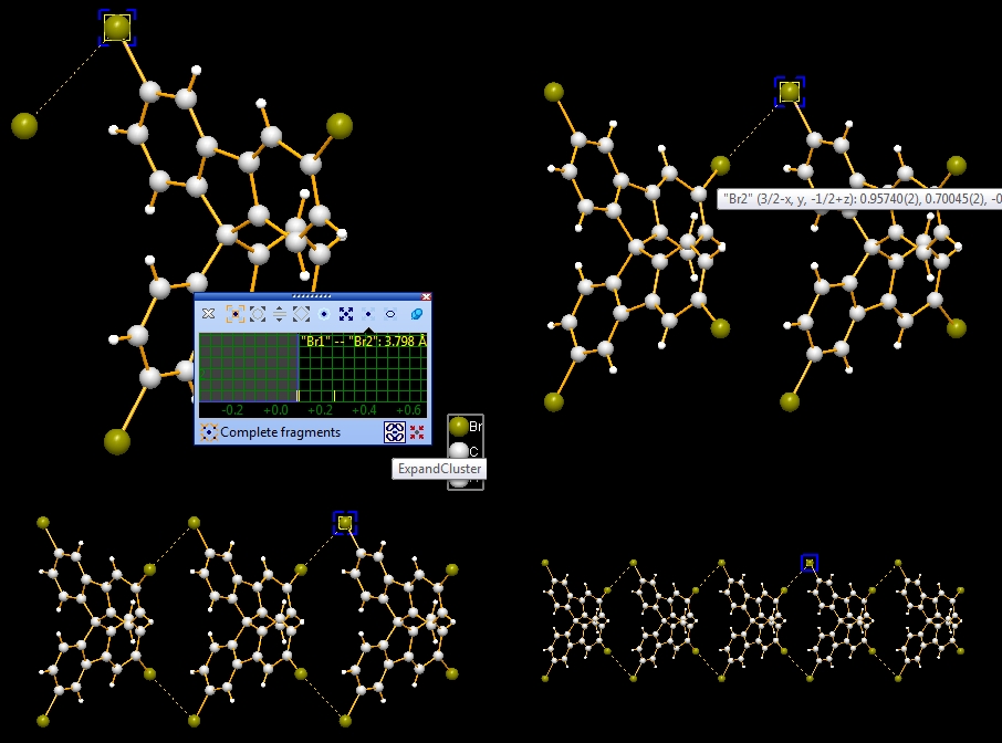 Now we make two sequences of neighbouring molecules using (a) the Br1--Br2 contact only, or (b) Br1--Br2 plus Br1--C11 contacts. To change from contact sphere evaluation (mouse wheel changes search radius) to expansion (a mouse wheel tick adds another contacted neighbouring molecule each), press the "Expand Cluster" button in the control window (see picture below).