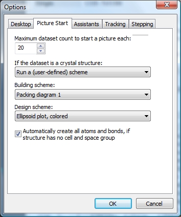 Picture Start Settings in Options dialogThe File Import Assistant shows options, if and how far to create a structure picture for every dataset in a non-Diamond input file on the page "Picture creation". But if you disable the File Import Assistant to be launched when opening a non-Diamond file, these options are not reachable. To make these options available every time, the picture start options are available from the Options command from the Tools menu which opens the dialog with several global settings and the picture start options on the Picture Start page: