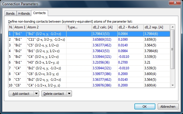 tabs (pages) for the bonding, contacting and H-bond parameters, rsp.