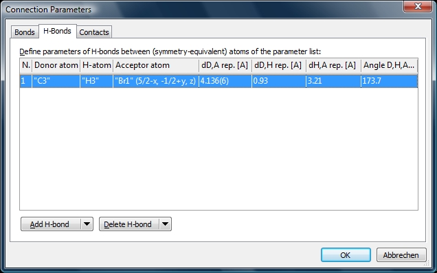 Screenshot of "H-Bonds" page of "Connection Parameters" dialog listing H-bond parameters