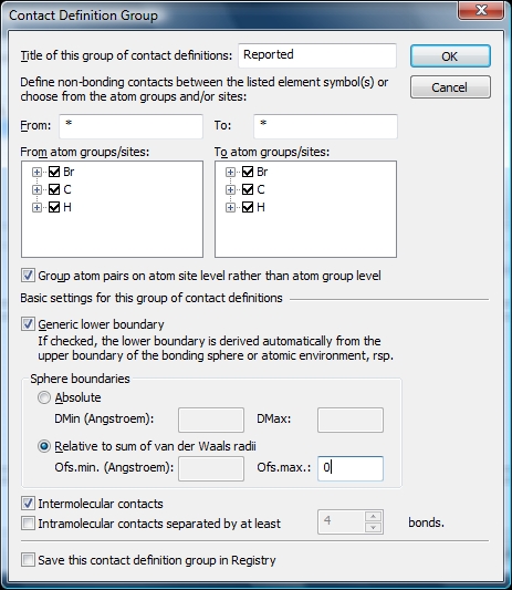A group of contacts, the "contact definition group" can be defined on atom group or atom site level or defined for selected elements and be stored in the Registry for later access in other compounds. The boundaries can be defined with absolute boundaries or relative to van der Waals radii sums, and intermolecular contacts (between atoms of different molecules) and/or intramolecular contacts (between atoms of the same molecule) can be enabled or disabled: