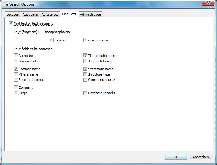 "Find text" page of the "File Search Options" dialog The search for text or a text fragment is different from the search on the other two pages "Restraints" and "References". Here you define a text (fragment) and select the text fields that Diamond shall search, whereas on "Restraints" and "References" every searchable field can have its own individual search item (text or number or formula etc.) The search for text (fragment) runs sequentially in any case, so it likely becomes a lengthy process. The screenshot shows the available settings. Don't forget to set the checkmark in the checkbox "Find text or text fragment" to enable the sequential search for the text (fragment) in "Text (fragment)" in the fields with checkmarks set.