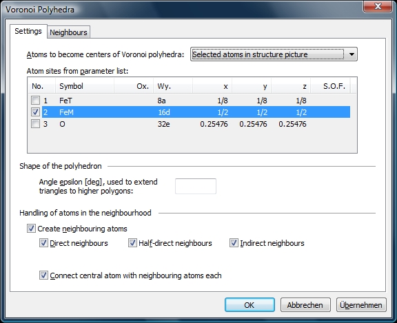 Again, like in the sample #1 (magnetite), we have the situation that not all atoms of the Voronoi polyhedron do contribute as (strongly connected) neighbouring atoms -- after evaluation of the overlap of spherical domains and Slater radii spheres.