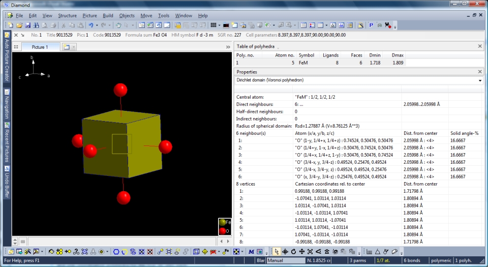 The second page shows the list of neighbouring atoms for the site that is selected or checked in the atom site list of the first page or (has been selected in the structure picture). Here the Dirichlet domain looks straightforward simple, six equidistant Fe--O distances of 2.06 Angstroms, leading to a regular cube with four vertices for the six faces each and a solid angle of 1/6 (or 16 2/3 percent).