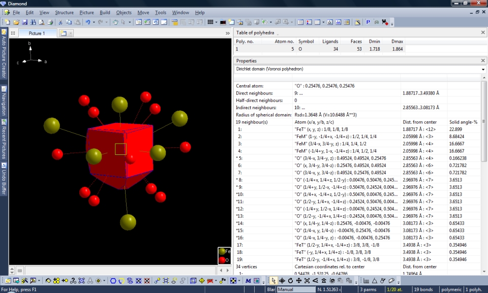 Previous article: Modification and duplication of polyhedra You should also read or have read this closely related article: Dirichlet Domains Sample #1: Magnetite The first sample of this article will use magnetite from COD:9013529, so open the sample file "COD-9013529.diamdoc". The data sheet shows us three atom sites in the atomic parameter list: "FeT", "FeM", and "O".