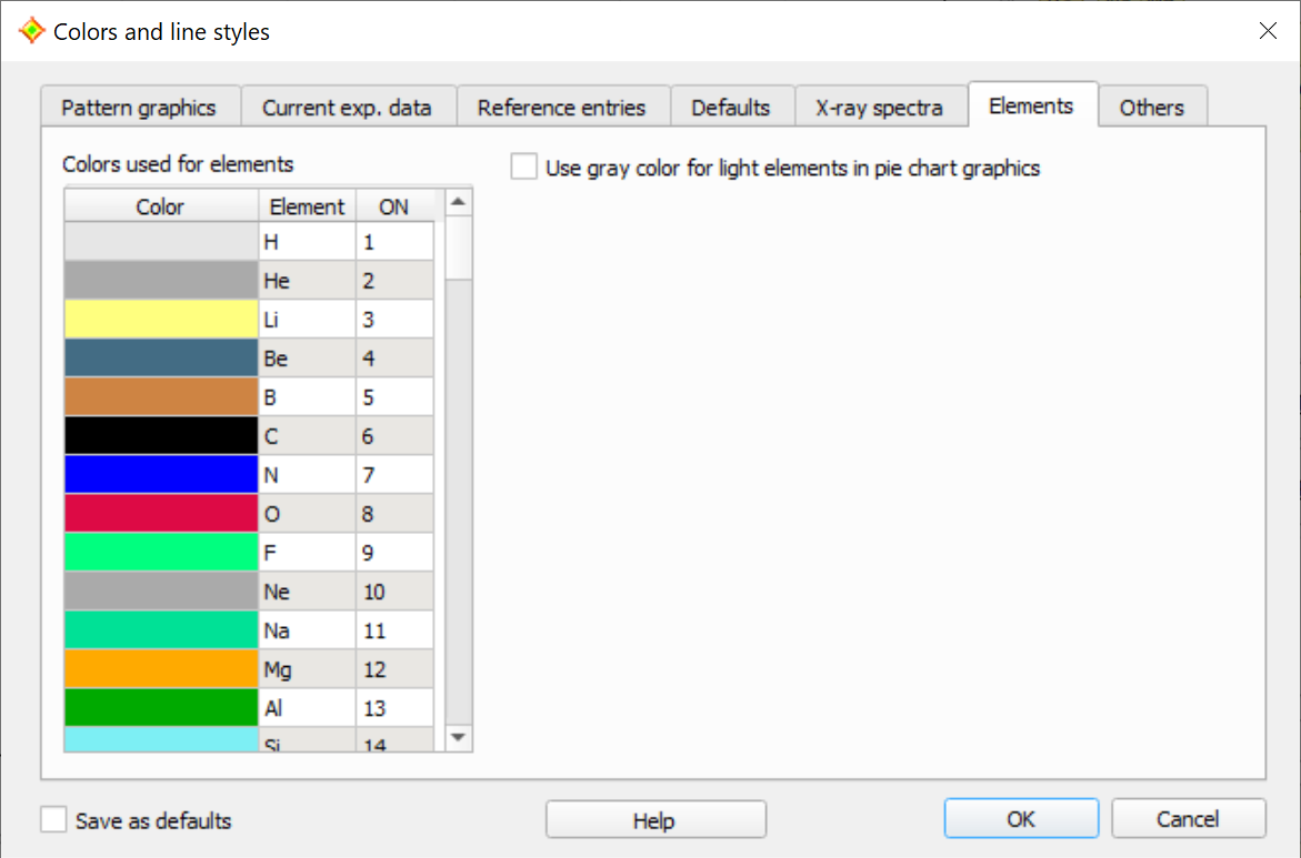If this option is active, the colors of light elements (i.e. all elements with ordinal number below 11 (Na)) are not used. Instead, Match! uses different gray colors for light elements, in order to distinguish the light elements from the other elements. The background is that the individual amounts of light elements may not be available in XRF (X-ray fluorescence) spectroscopy results, so that they can be combined as "remaining" or "not included" elements.