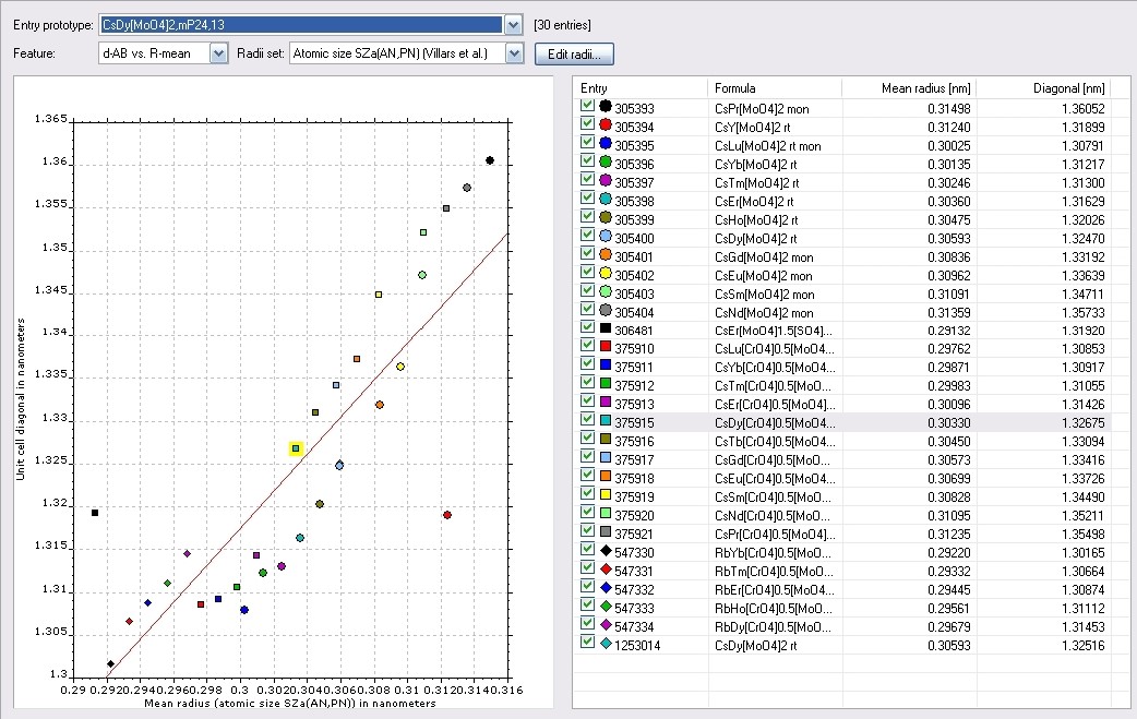 Pearson's Crystal Data Features: Radii/volumes diagram